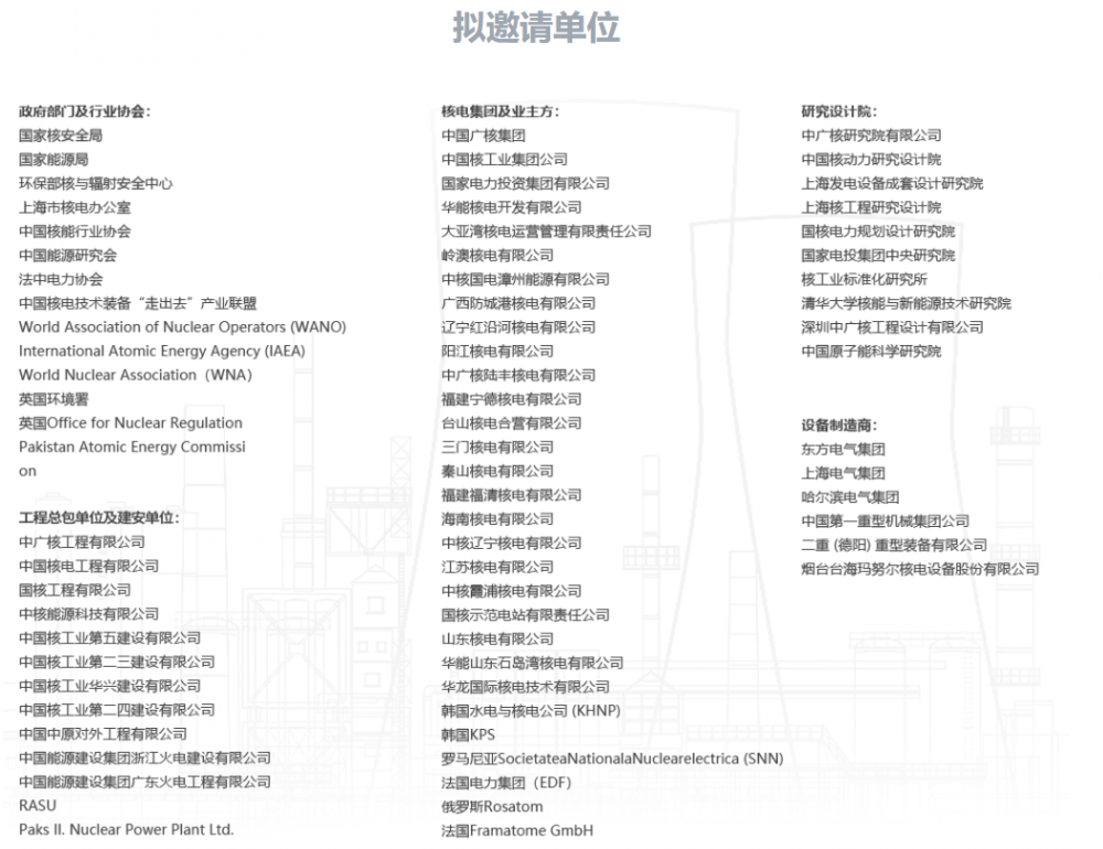 大会作为核电新建领域的年度盛会,已成功连续举办十五届。历届有100多家企业的近300位代表参加,30多位专家分享报告,20多家企业参展,往届大会共吸引了来自中、美、英、法、俄、加、韩、巴等10多个国家和地区的代表参加,国家核安全局、国家能源局、国际原子能机构、世界核协会、上海市核电办公室、嘉峪关市人民政府、苍南县人民政府、中国核工业集团有限公司及下属单位、中国广核集团及下属单位、国家电力投资集团有限公司及下属单位、中国华能集团有限公司及下属单位、俄罗斯国家原子能集团公司等单位均有安排专家出席。