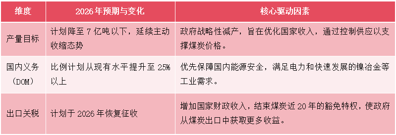今日智库搜集梳理了2026年印尼煤炭市场最关键的变化预期,详见下表: